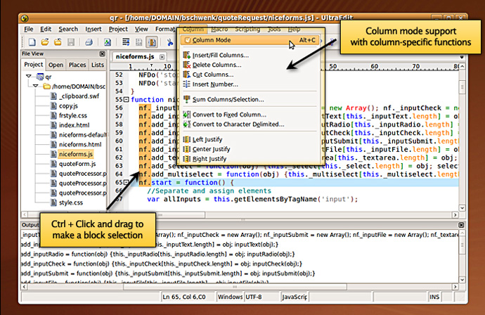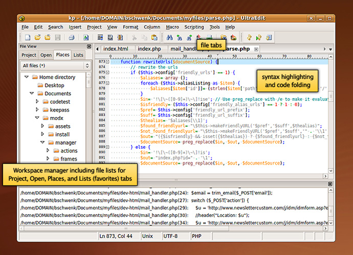 UltraEditÀÇ °¡Àå Àß ¾Ë·ÁÁø Ư¡ ÁßÀÇ µÎ °¡Áö´Â ¾Æ¸¶µµ ±¤¹üÀ§ÇÑ ±â´É ¼³Á¤°ú ±¸¼º ´É·ÂÀÏ °ÍÀÔ´Ï´Ù. ¹°·Ð ÀÌ µÎ °¡Áö ¼Ó¼ºÀº UEx¿¡¼­µµ Áö¿øµË´Ï´Ù. UltraEditÀÇ ´ëºÎºÐÀÇ ±â´ÉÀ» »ç¿ëÇÒ ¼ö ÀÖÀ¸¸ç, µ¿½Ã¿¡ ¸®´ª½º¿¡¼­ ÀÛ¾÷ÇÒ ¶§ÀÇ °­Á¡µµ Ȱ¿ëÇÒ ¼ö ÀÖ½À´Ï´Ù. ¸®´ª½º¿ë UltraEdit´Â »ç¿ëÀÚ µµ±¸ Ãâ·Â ÄܼÖÀÇ ¼±ÅÃÀ̳ª ÇÁ·ÎÁ§Æ® ÆÄÀÏ/Æú´õ¸¦ ãÀ» ¶§ ÆÄÀÏ ºê¶ó¿ìÀú ¼±Åà °°Àº ÀϺΠ¸®´ª½º ƯÁ¤ ±¸¼ºÀ» Æ÷ ÇÔÇϰí ÀÖ½À´Ï´Ù. ¹°·Ð ¿ì¼± ¼±Åõµ Áö¿øÇÕ´Ï´Ù.